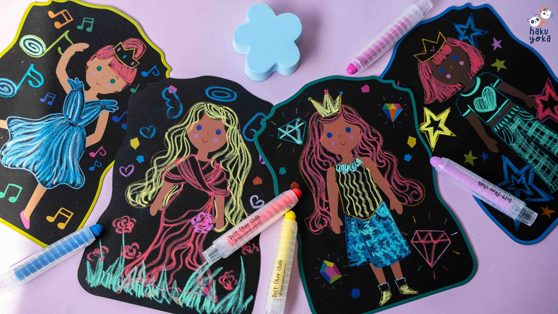 6 dust-free chalks, 5 double-sided chalk pads, eraser and booklet