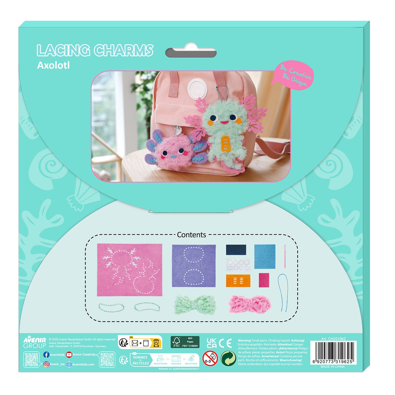Use pre-cut fabric, large-eyed needle, big clear holes, and super fluffy yarns to follow the steps and lace two lovely axolotl pendants! Attach them to the included metal chains for unique DIY accessories.