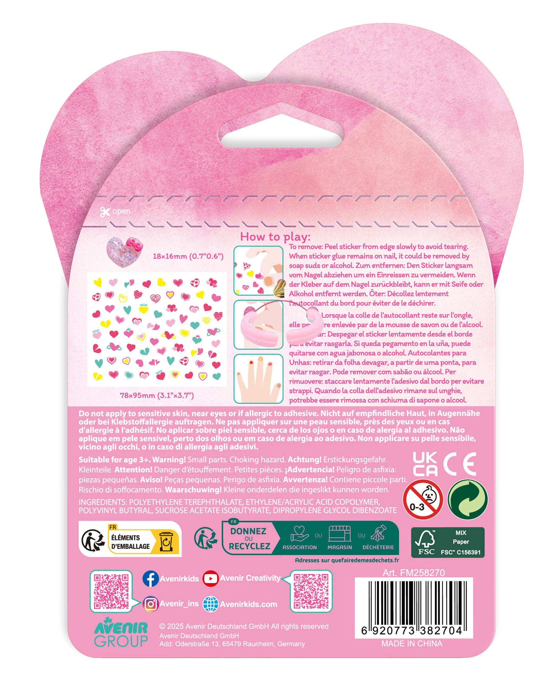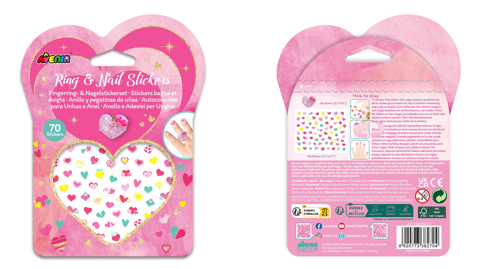 This set includes 70 colourful nail stickers and a playful ring. Easy to apply and remove, it’s perfect for dress-up and fashion play.